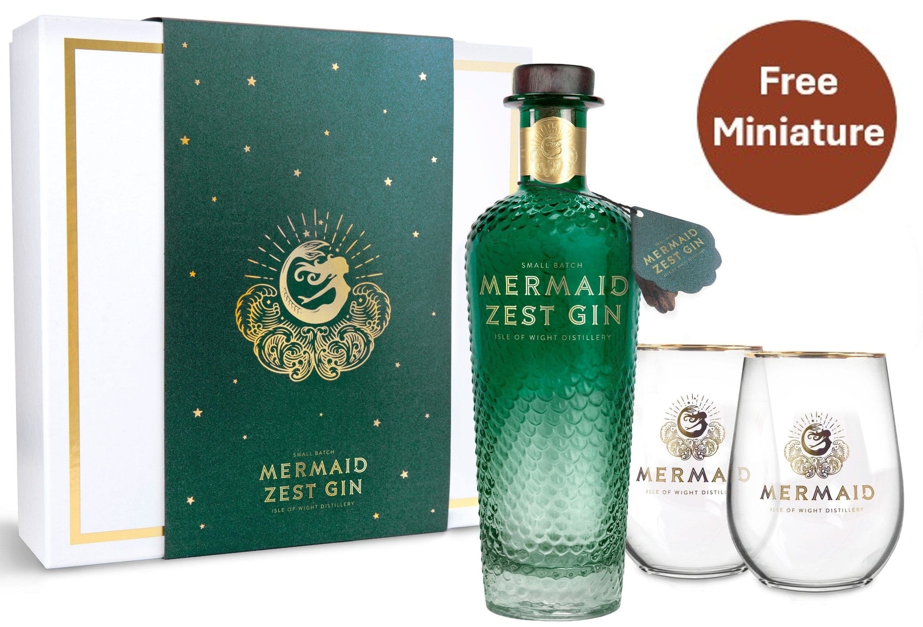 Elegantly presented in a plastic-free gift box, the Mermaid Zest Gin gift set includes zingy and herbaceous Mermaid Zest Gin 70cl and two gold-patterned tumblers.